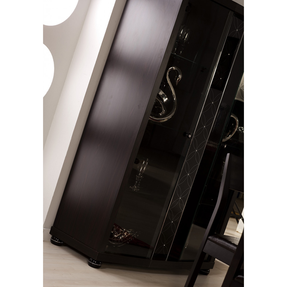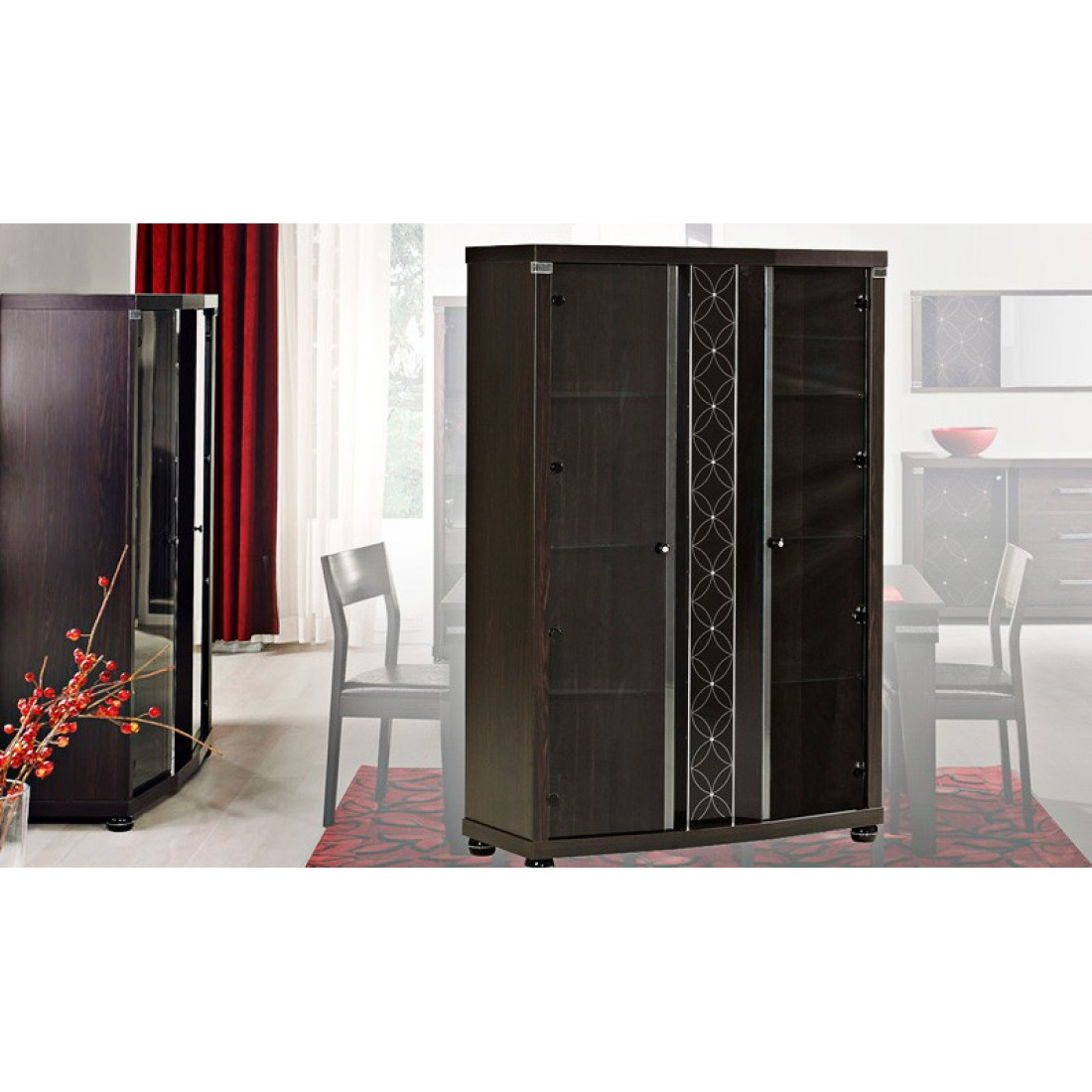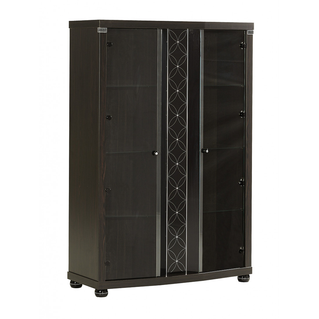 Двухстворчатый шкаф-витрина в гостиную MIRA-01 (венге) серии Мира от Беллона выполнен в ультрамодном стиле модерн, сочетающим в себе гармоничную симметричность классики и лаконичность минимализма. Купить стильную модель витрины (серванта) для обстановки гостиной, кабинета стоит и за добротное исполнение: практичная конструкция сопровождается использованием для полок, фасадной части каленого стекла, абсолютно безопасного при случайном разбитии.