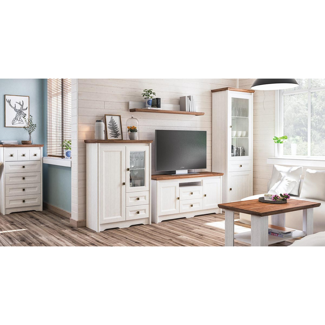 В композиции мебели для гостиной Тиволи присутствуют все элементы, которые призваны обеспечивать комфорт и максимум удобства своим хозяевам: эргономичная тумба под теливизор, высокая многофункциональная тумба, застекленный книжный шкаф (витрина), открытые навесные полки. При желании можно купить модульную гостиную Тиволи, укомплектовав другими элементами серии.