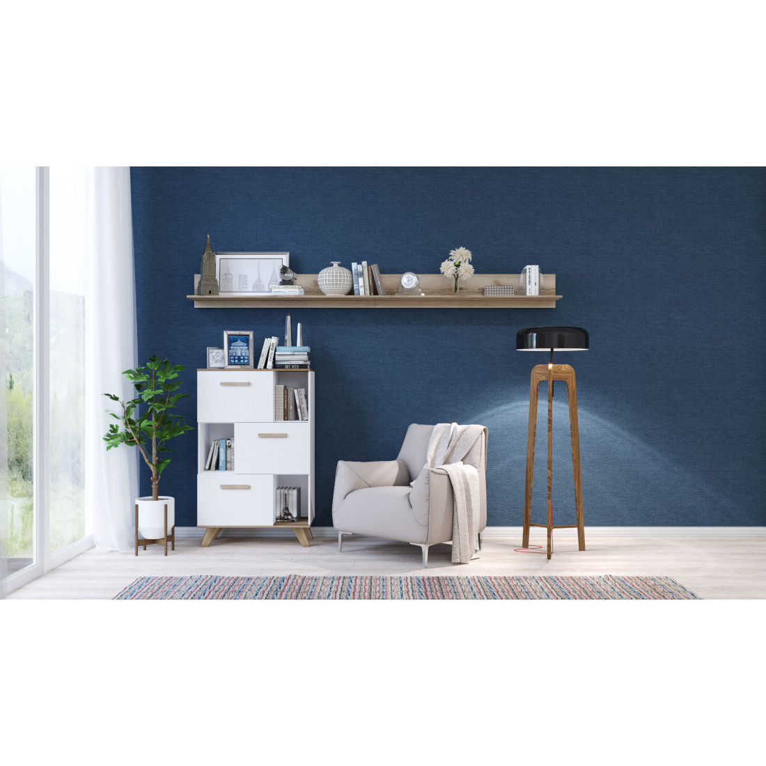 Набор мебели Вега Скандинавия украсит небольшую гостиную. Цвет гостиной соответствует скандинавскому стилю - сочетание природного оттенка древесины «Дуб каньон» с глянцевым белым цветом. В комплект входит удобный и низкий шкаф с дверцами и нишами  для хранения и размещения предметов. Украшают композицию две навесные настенные полки