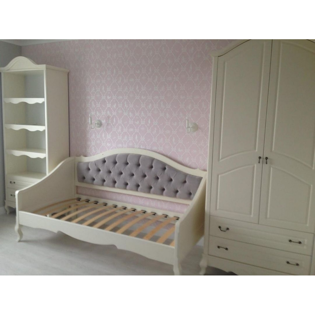 Кровать оснащена ортопедическим основанием для матраса — ламелями.